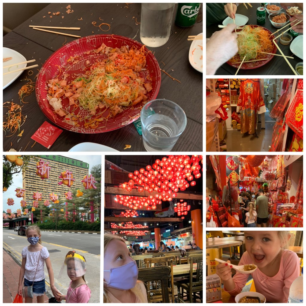 En viktig tradisjon ved kinesisk nyttårsfeiring her i Singapore er kasting av Yu sheng, eller Prosperity Salad (som blir noe sånt som velstandssalat på norsk). Ingrediensene er nøye utvalgt og alle har en spesiell betydning (🍊🥕🥒🦪+ mye vi ikke klarte å indentifisere). Mens man kaster salaten opp i luften ved hjelp av spisepinner roper man ut ønsker, drømmer og fine ord. Og jo mer som kommer utenfor tallerkenen jo bedre får man det angivelig. Rare greier. Men veldig gøy😋