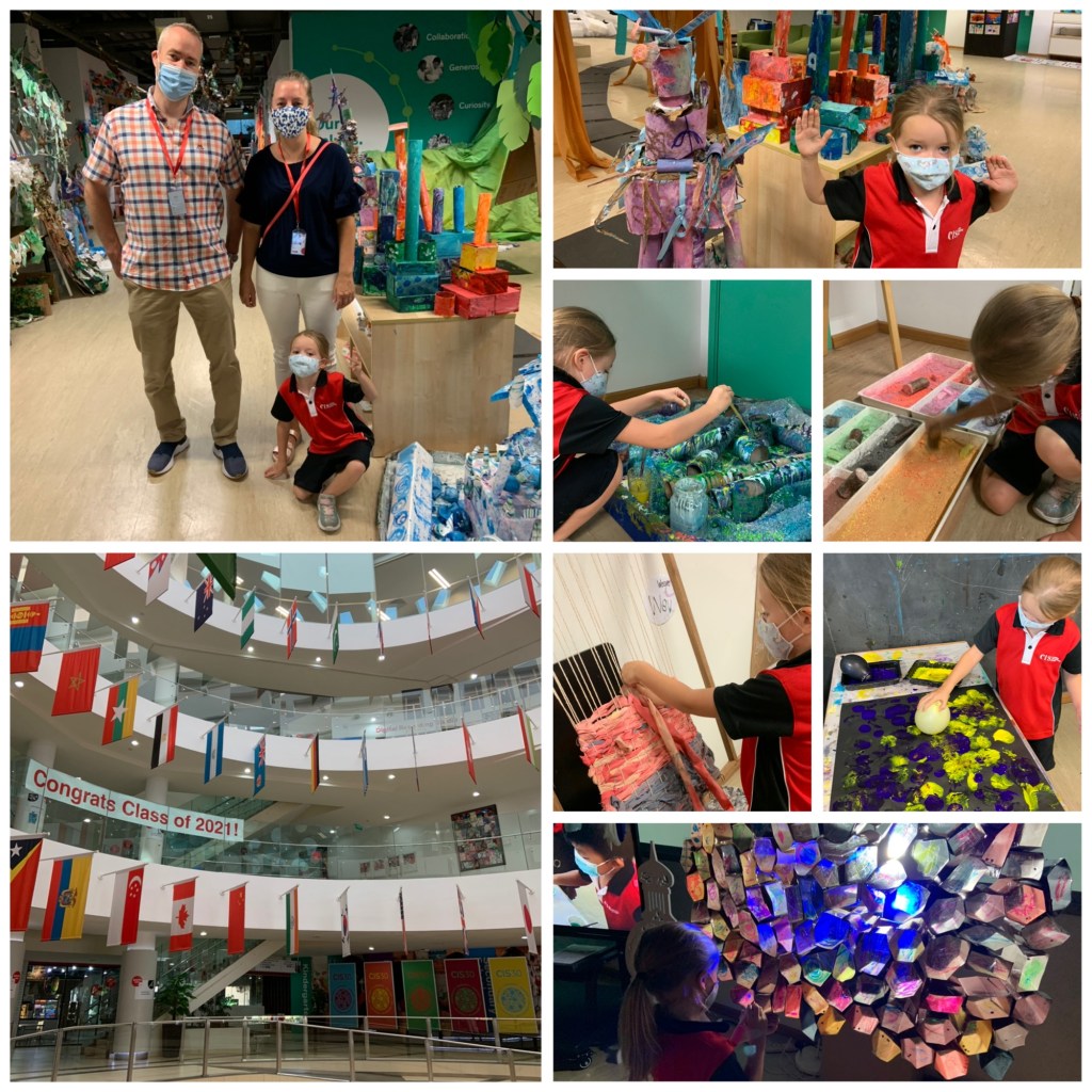 Så fikk alle barna vise foreldrene sine rundt. Vi spredte oss utover og prøvde så godt vi kunne å holde 1-meters regelen. Utstillingen gikk over et stort område og det var masse fine kunstverk å se på, og ikke minst masse rare aktiviteter å prøve. For eksempel kunne man knuse kritt, pusle med skjell, male med ballonger, klippe malt plast i strimler og lage blekkspruter, veve, spille musikkinstrument og masse masse mer. Etter 40 minutter måtte vi følge barna tilbake til klasserommet og si hadet bra. Deretter ble vi «tryllet» om til vanlige voksne igjen, og fikk så beskjed om å returnere til den vanlige verdenen.