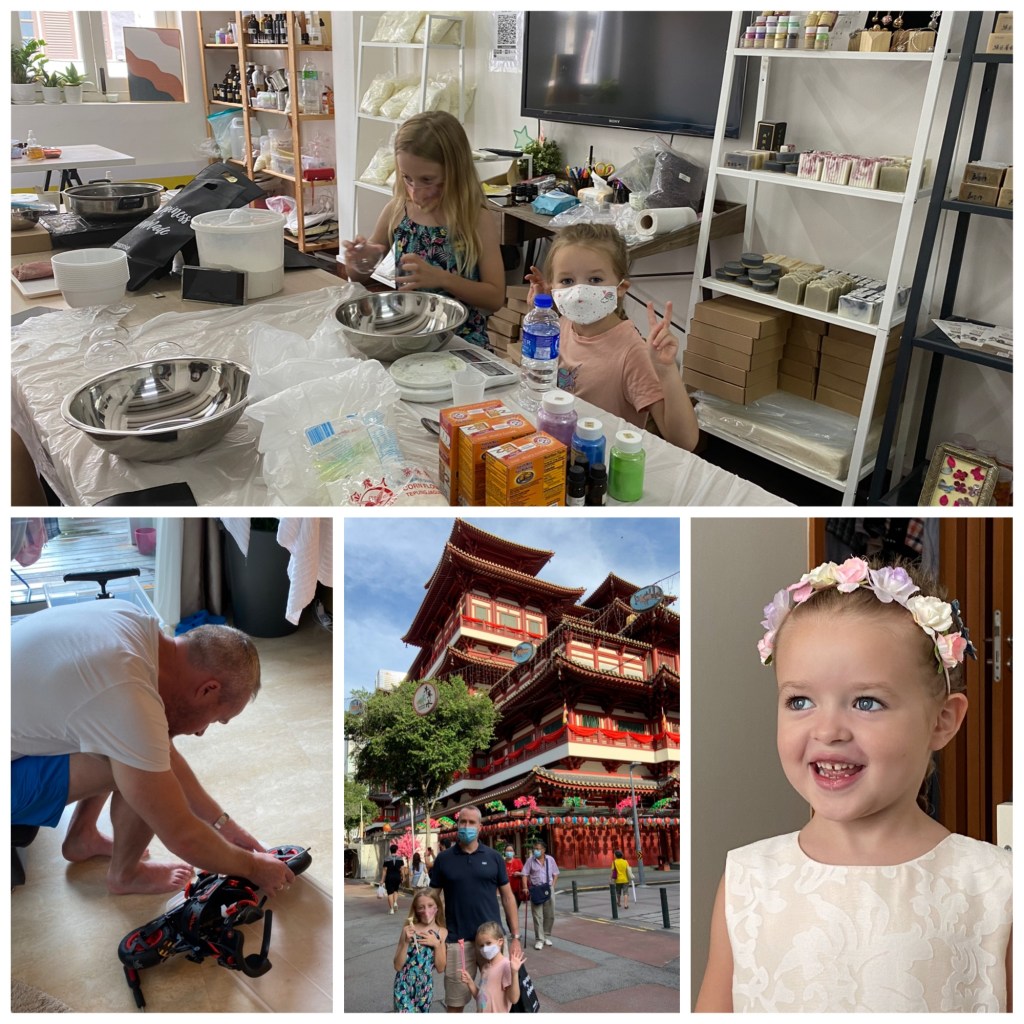 Jentene på badebombekurs, Hans Christian som grisler (som alltid), flott bygg i Chinatown og fine Nora’en vår som er klar for bursdag🥰