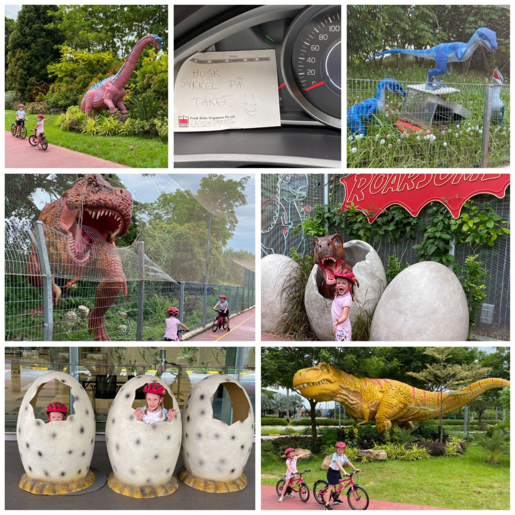 På lørdag var Hans Christian og jentene på sykkeltur, mens jeg var hos frisøren i 2,5 timer🙈 De testet ut vårt nye sykkelstativ på bilen, og dro ut på flyplassen for å sykle en strekk kalt Jurassic Mile. Den starter ved Changi. Opplegget er veldig gøy, langs en gang- og sykkelsti på litt over 1km har de plassert ut flere titalls life size dinosaurer. Den høyeste er nesten 5 meter! De er plassert langs gjerdet og ser nokså ekte ute. Enkelte ser ut som det holder på å bryte seg ut gjennom gjerdet, mens andre seg ut som de har overtatt en golfbil (utstillingen står i utkanten av en golfbane). Jentene synes det var veldig kult.