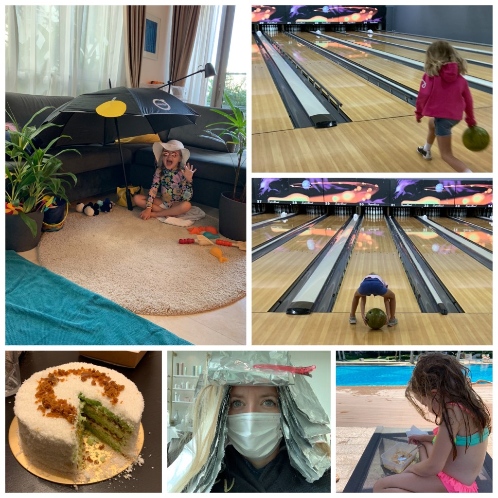 Noen flere glimt fra helgens begivenheter; kake, hårfarging, risgrøt ved bassenget, beach party og bowling.