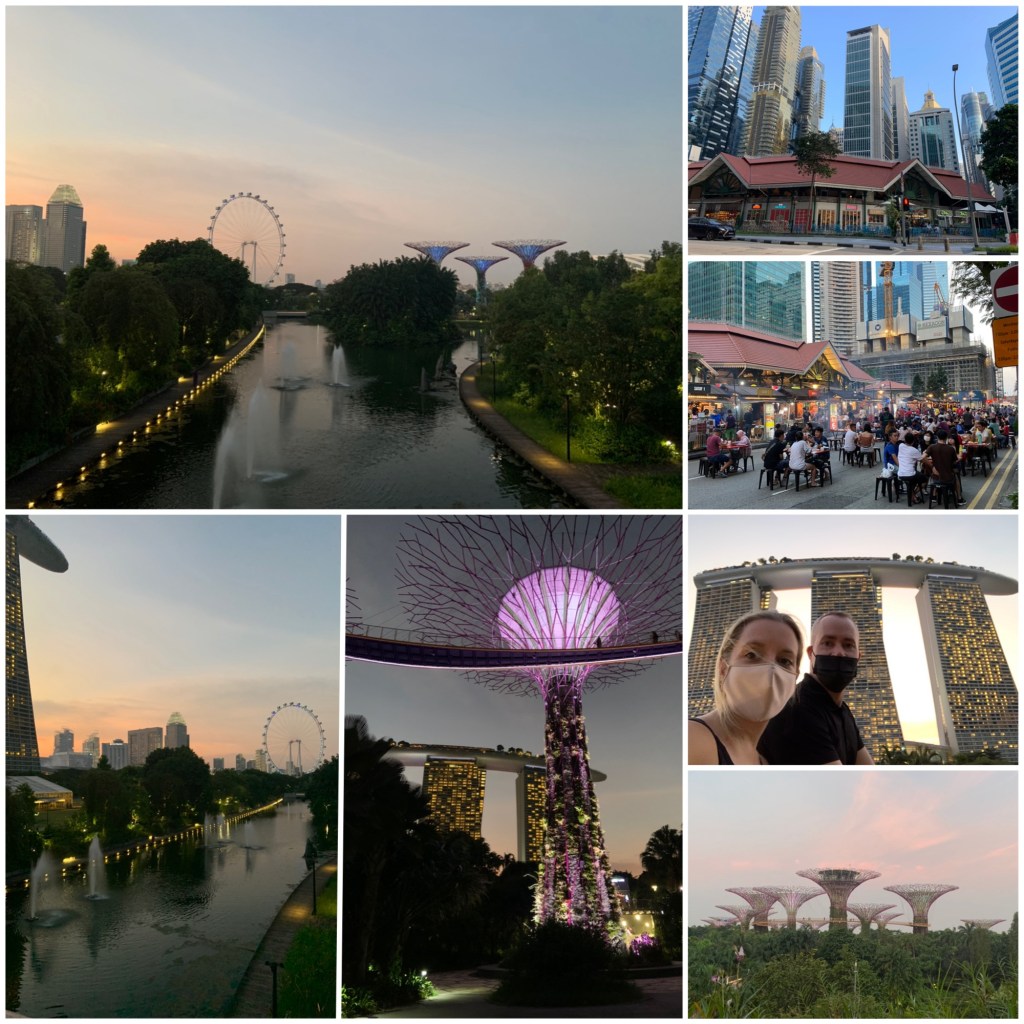 Etter maten dro vi ut i Gardens by the Bay. Hver kveld mellom 19 og 22 er det lysshow og musikk i supertrærne, noe vi tenkte vi skulle få med oss. Dessverre var dette tonet veldig ned for å inngå å tiltrekke så mange mennesker til parken. Men vi koste oss likevel. Vi så på solnedgangen over byen, nøt de få lysene som var i trærne, og avsluttet det hele med en is.