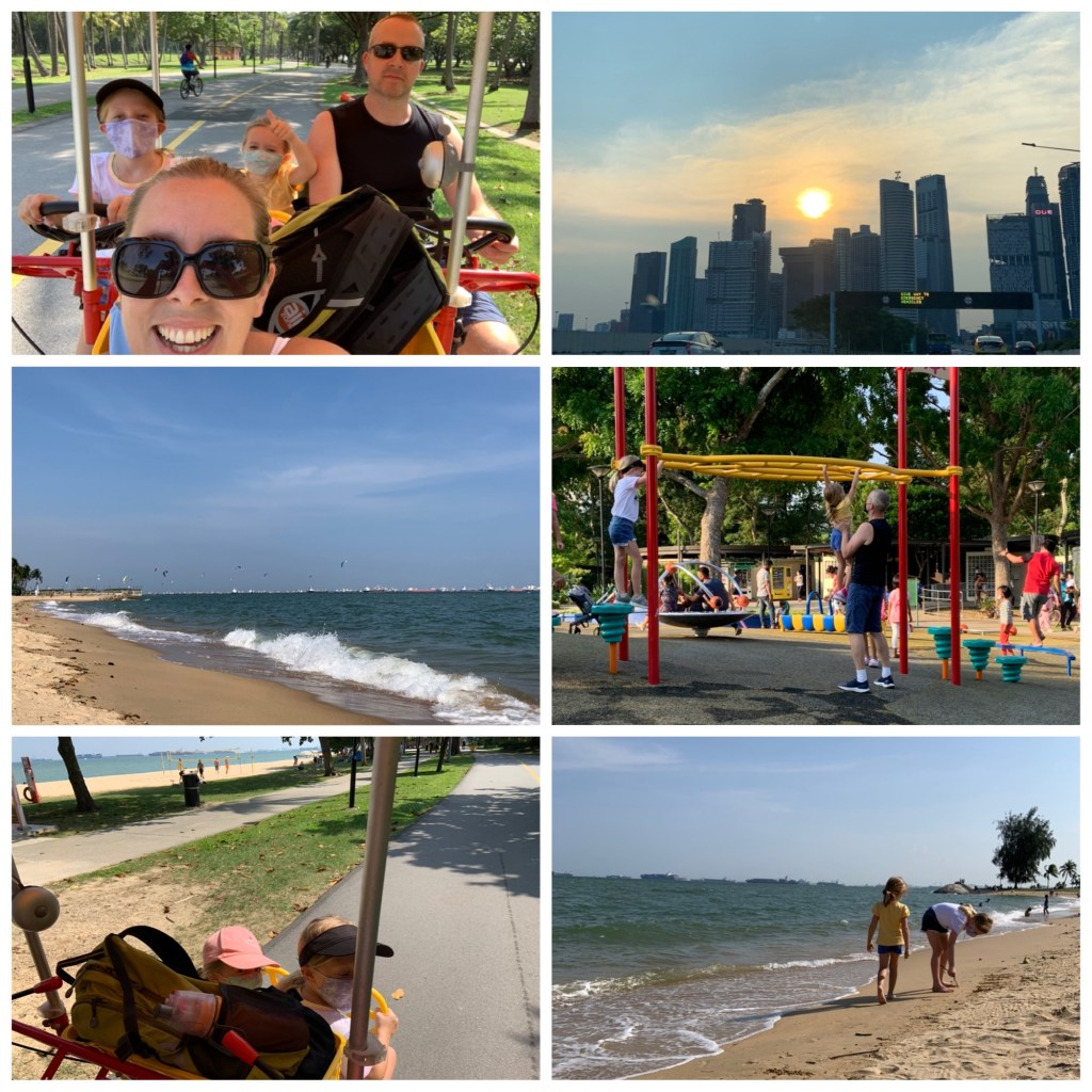 I går, søndag, tok vi turen ut i East Coast Park og leide oss en firemannssykkel. Det har vi tenkt på lenge, så det var litt kjekt at vi endelig fikk somlet oss til det. Den hadde to seter med pedaler bak, og to mindre seter (for barn) uten pedaler foran. Vi startet med barna foran og foreldrene ved pedalene. Men i løpet av turen endret konstellasjonen seg, og jeg ende opp i barnesetene foran mens resten av gjengen satt barn og trødde. Vi fikk en del blikk, men jeg synes det fungerte helt supert😁 Hvis du ser bort fra litt dårlig beinplass.