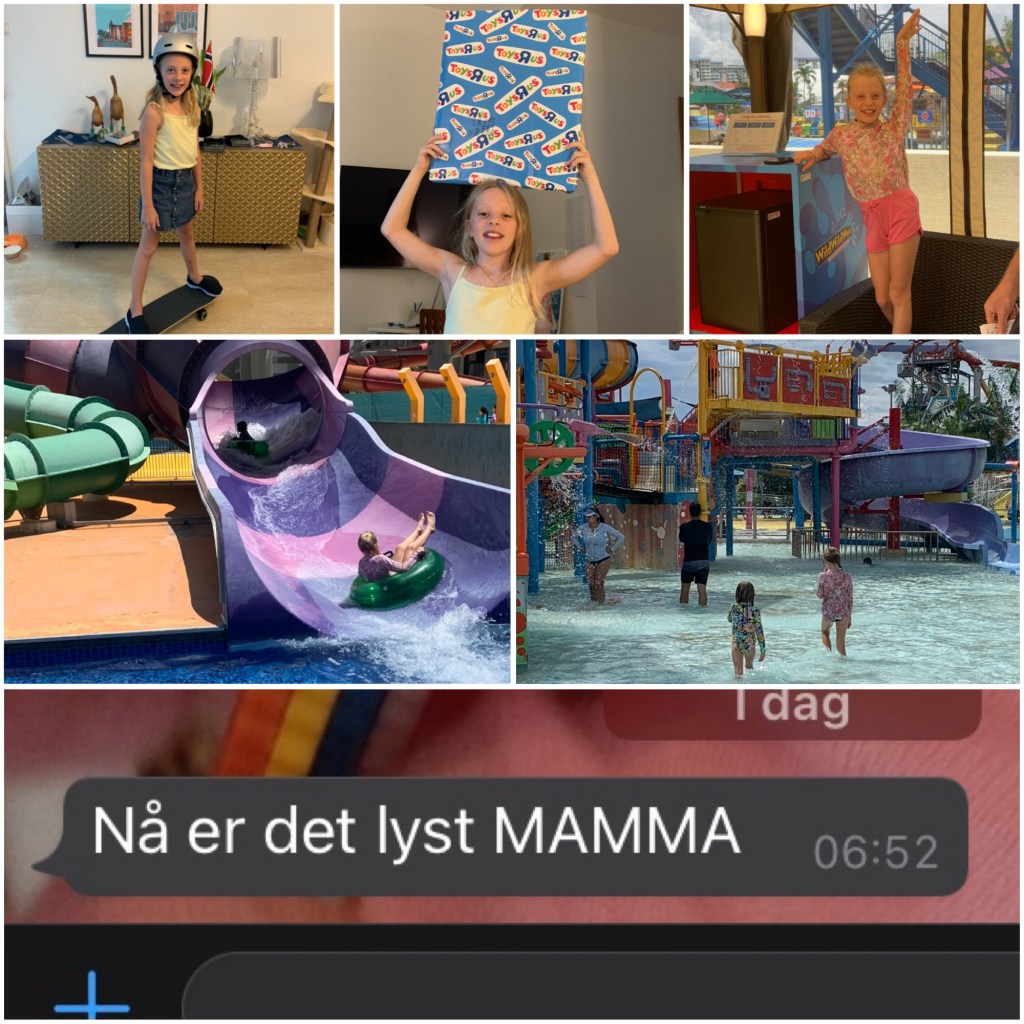 Etter å ha fortært de bestilte pannekakene (som jeg mener jeg kunne laget bedre selv😉), pakket opp masse gaver og sunget bursdagssangen på kinesisk, dro vi altså i badeland. Der var til og med mor gjennom diverse sklier, og Nora turte seg også opp i en av de større skliene. Alle var glade og ingen var solbrent (klok av skade) da vi dro, det må være bra😄