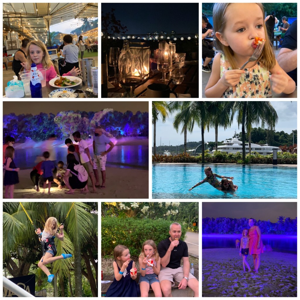 På kvelden hadde vi booket oss inn på et slags interaktivt lysshow på stranden på Sentosa. På videoer vi så på nett så det skikkelig kult ut! Vi dro ut litt i forkant for å få i oss en matbit. Men da vi kom ut var der ingen bord å få, så vi måtte gå for take away. I disse covid-tider må man booke plass på stranden her, et opplegg som er helt håpløst, så i stedet for å sitte på stranden og spise måtte vi sitte på en fortauskant og spise, mens vi så ut på stranden🙈 Heldigvis reddet vi inn igjen det hele med en runde hopping på noen store trampoliner og en liten is til hver (utenom meg da, jeg overholdt utfordringen min om ikke å spise godteri i januar, til dersom måtte lure😉). En veldig liten, men gøy ting som skjedde da vi stod og så på jentene som hoppet var at det kom en enorm fugl flygende rett over hodene våre. Jeg kvapp veldig og måtte full fart snu meg og se hva det var. Og der, rett ved siden av oss på sanden, landet en gigantisk påfugl🦚 Jeg har aldri reflektert over at de faktisk kan fly😄