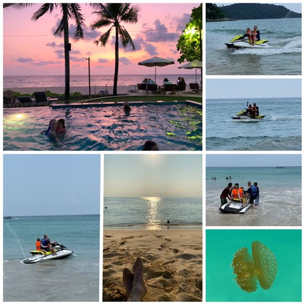 Hans Christian og jentene leide vannskuter en ettermiddag. Etterpå nøt vi kvelden på stranden og bassenget🤩