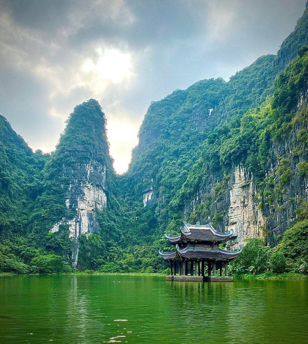 Da vi kjørte ut av Hanoi på morgenen, var himmelen grå og det var lett regn i luften. Regnet stoppet etterhvert, men himmelen var fremdeles grå da vi hadde kjørt i 2 timer, noe som gjorde sikten nokså dårlig. Men plutselig, mens vi kjørte gjennom den lille byen Ninh Binh, skimtet vi en kjede med små, spisse fjelltopper gjennom skyene. Fjellene her i nord-Vietnam består i stor grad av kalkstein, noe som gjør dem lett eroderbare. Dette i kombinasjon med en god del nedbør og elver som stadig eroderer, er det som har gitt de karakteristiske formasjonene og utallige huler og grottesystem. De spesielle formasjonene med sukkertopp-formede fjell, grotter og huler, går igjen også i Halong Bay. Denne typen formasjoner var det også mange av i bukten med James Bond Island vi besøkte i Thailand i høst, om noen husker bildene derfra.