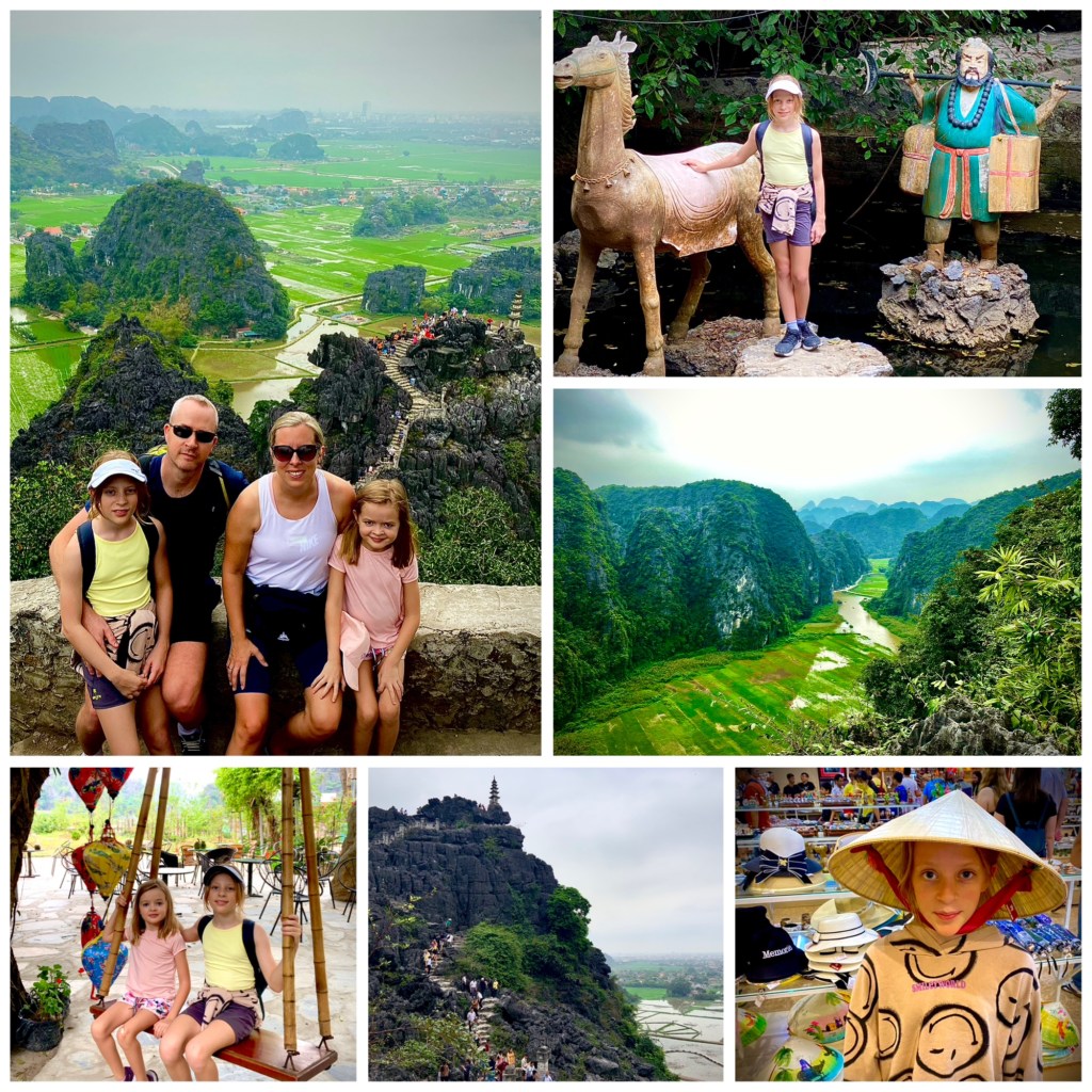 Stopp nummer en var foten av et fjell. Herfra var det omtrent 500 trappetrinn opp til toppen. Litt tungt var det, jeg kan si med sikkerhet at trinnene ikke fulgte trappeformelen. Men utsikten fra toppen var definitivt verdt det! På fremsiden av toppen hadde man utsikt utover Ninh Binh. Baksiden av toppen vendte mot flere fjelltopper med en dal i midten. Bunnen av dalen bestod av en elv som delvis oversvømte store rismarker. Det var et mektig skue, på en måte minner fjellene og dalene om landskap man kan finne i Norge. Men samtidig er det veldig eksotisk og spektakulært. Vi er så heldige som får muligheter til å oppleve steder som dette😍