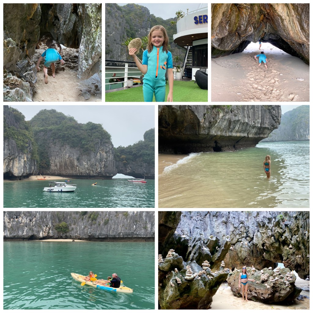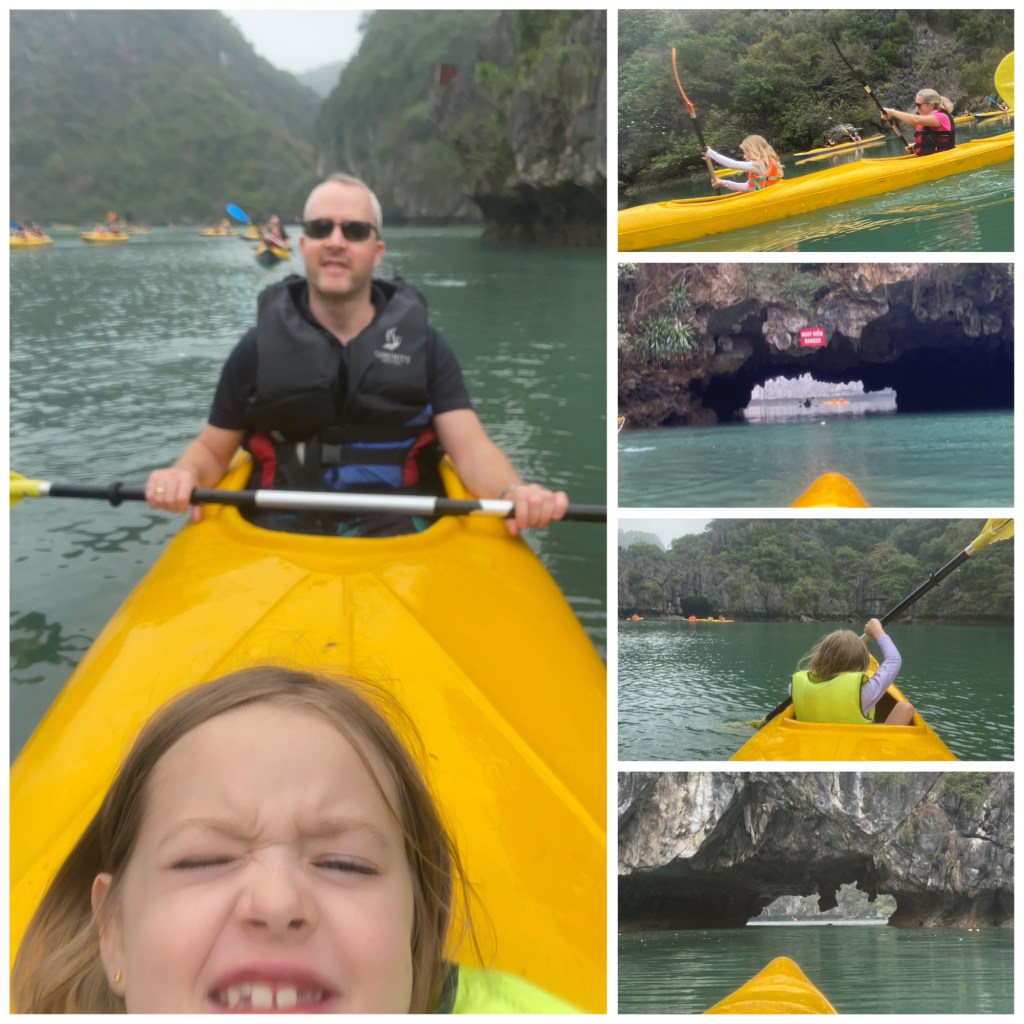 Etter å ha seilt en god stund, stoppet vi inne i en (av mange) lagune hvor de lokale drev kajakkutleie. Selvfølgelig fra et lite kompleks som fløt ute på vannet. Julia og meg fikk en kajakk og hver sin padleåre. I kajakk nummer to satt Hans Christian og Nora. Hans Christian med padleåre og Nora med kamera (telefon). Med en guide i front padlet vi avsted, gjennom flere grotter, inn i små laguner med apekatter i, og mellom flotte fjellformasjoner. Hans Christian storkoste seg når han fikk padlet litt etter gammelt, og vi andre koste oss og😊