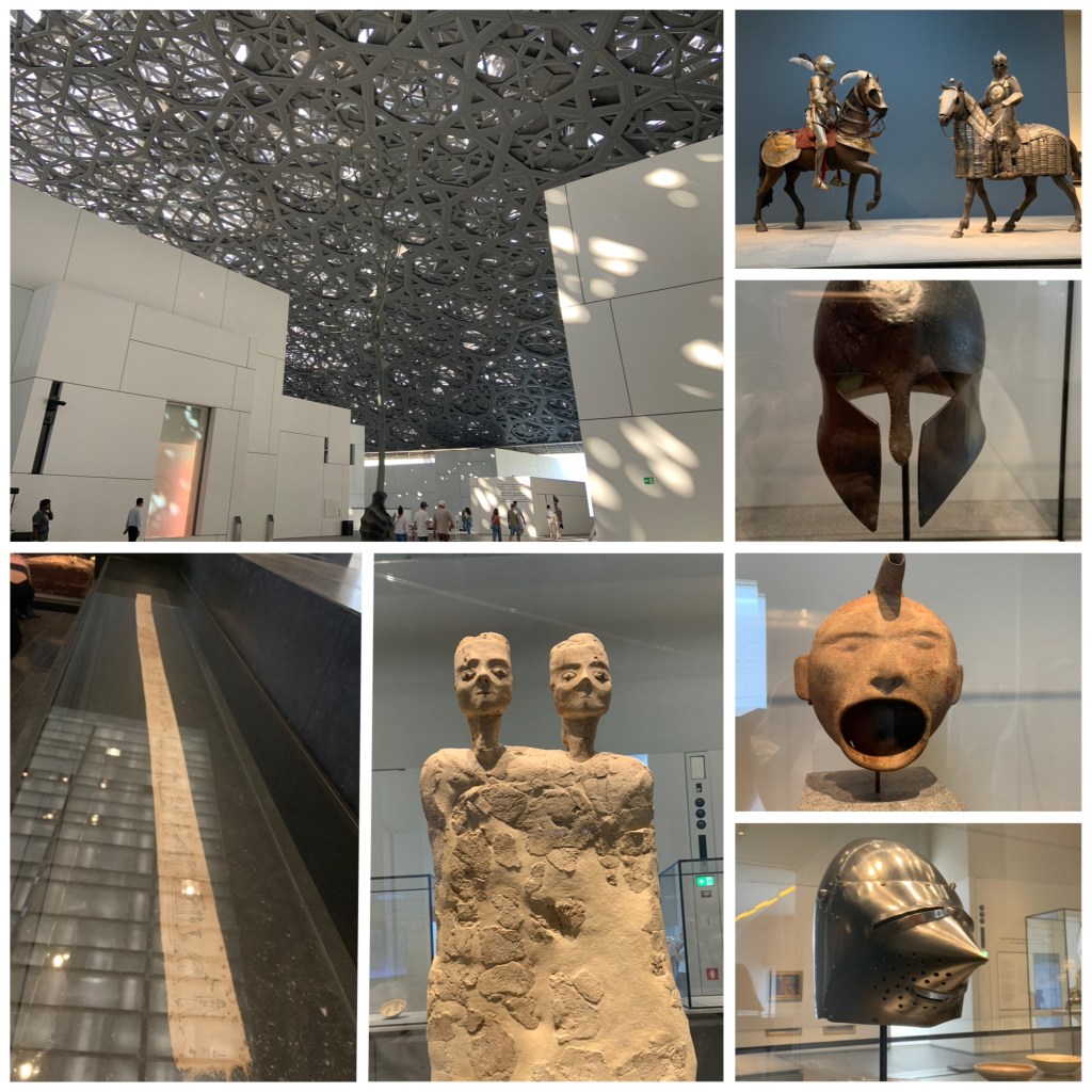 Men ja, Louvre. Det var et nydelig flott museumsbygg. Bestående av mange hvite «kuber» flytende på vannet, var det alltid et vindu man kunne se vann fra. I midten av alle kubene var en stor åpen plass med trær og fugler. Og over det hele var en enorm kuppel bestående av 7.850 stjerne i ulik størrelse som var flettet inni hverandre. Det hele gav stedet en deilig avslappet og litt majestetisk følelse. Og ikke nok med det så var utstillingene veldig interessant arrangert. Etterhvert som man flyttet seg fra kube til kube flyttet man seg også fra oldtiden og frem til moderne tid. Og kunstverkene var satt opp slik at hver installasjon inneholdt kunstverk fra ulike steder og ulike kulturer i verden. Da ble det veldig tydelig hvordan de ulike kulturene har utviklet seg nokså ulikt rundt om i verden. Om noen noen har tenkt seg til Abu Dhabi en dag anbefaler jeg virkelig en tue innom dette nydelige, smått imponerende museet!