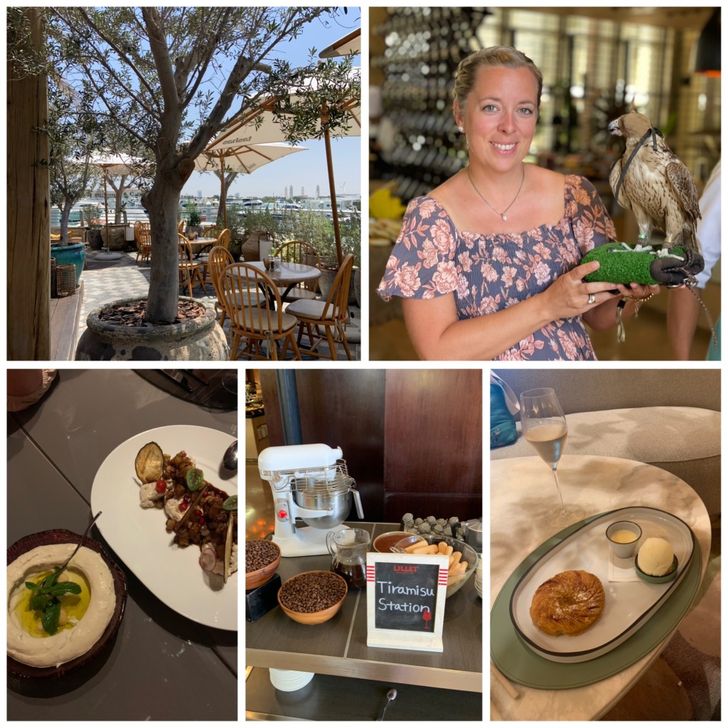 Og helt plutselig stod det også en mann med en falk midt i restauranten. Falkehold er veldig vanlig i UAE, det er ett av få dyr som trives der. Den forhold seg rolig, den hadde hette over øynene, men den hadde nebbet åpent og tungen beveget seg hele tiden og hodet gikk fra side til side. Eieren forklarte at fuglen kan smake på luften. Stakkar, den må jo ha blitt sulten, eller i hvert fall forvirret, av alle luktene inne i restauranten. Men for et elegant dyr. Og for noen instinkt.