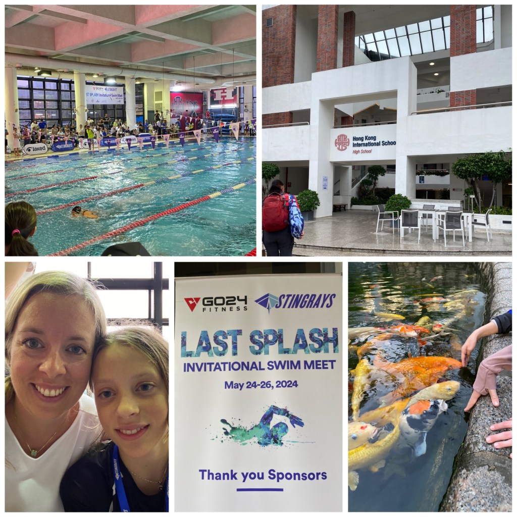Konkurransen har nærmere 500 svømmere fordelt på 19 lag, fra Hong kong, Kina, Japan, Filippinene, Vietnam, Singapore og Saipan! (Google Saipan, for det er ganske imponerende). Det er Hong kong International School som arrangerer konkurranse denne gang. Skolen er lokalisert sørøst på hovedøyen, et godt stykke utenfor sentrum. Som sagt er øyen meget kupert, men veien hit var mer enn interessant. Den minnet om veien mellom Bjørkheim og Nordheimsund (bare kortere) før de lagde alle tunnelene. Det var svingete og smalt, og med stup ned på ene siden. Og med masse trafikk, som førte til mye stopping. For barn som er oppvokst i Singapore der alt er flatt, og alle veien har flere felt, var visst dette veldig skummelt. Men vi kom alle helskinnet frem.