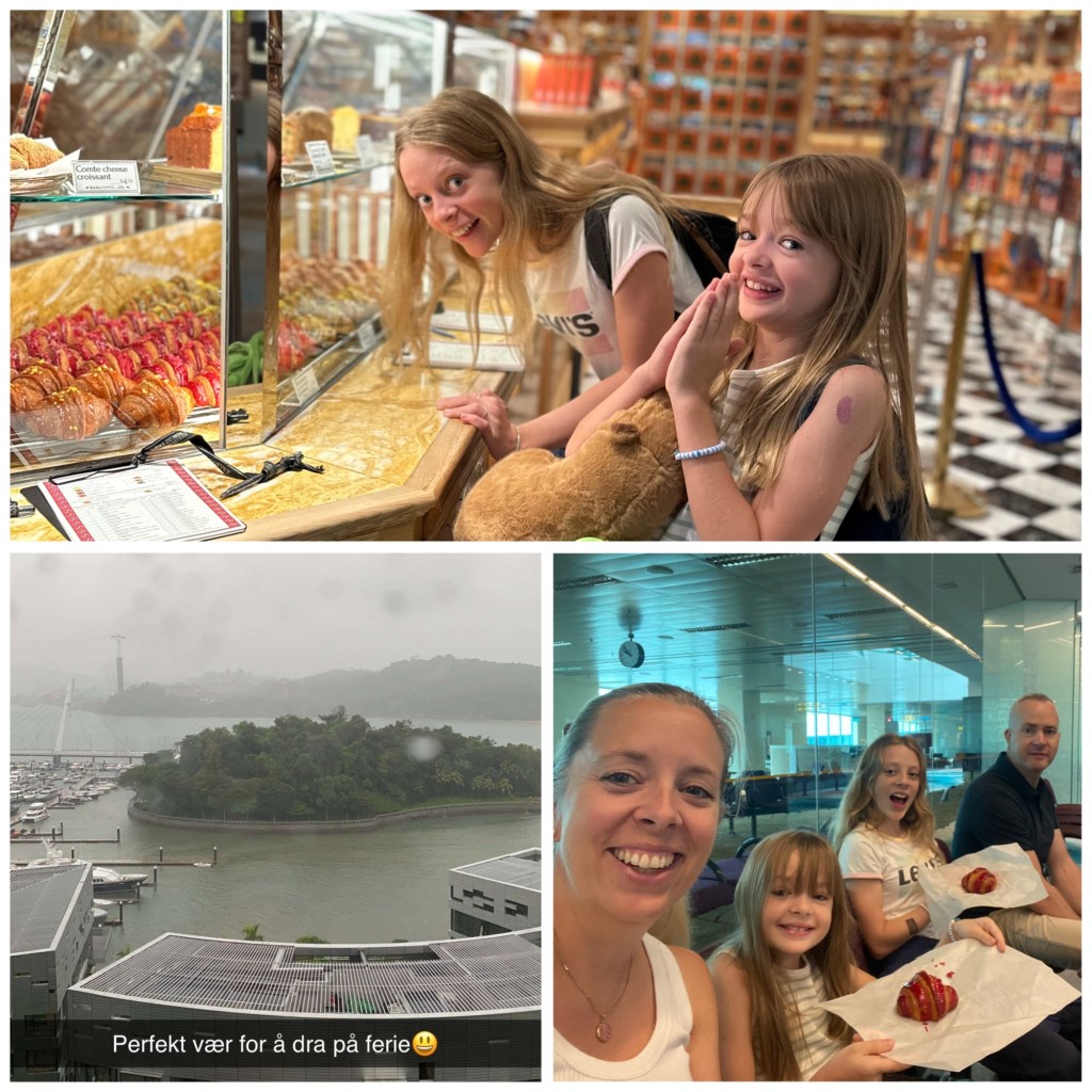 Det var en særdeles grå morgen i Singapore da vi dro. Fremme på flyplassen insisterte jentene på at vi måtte kjøpe croissanten, det er visst blitt en tradisjon😅