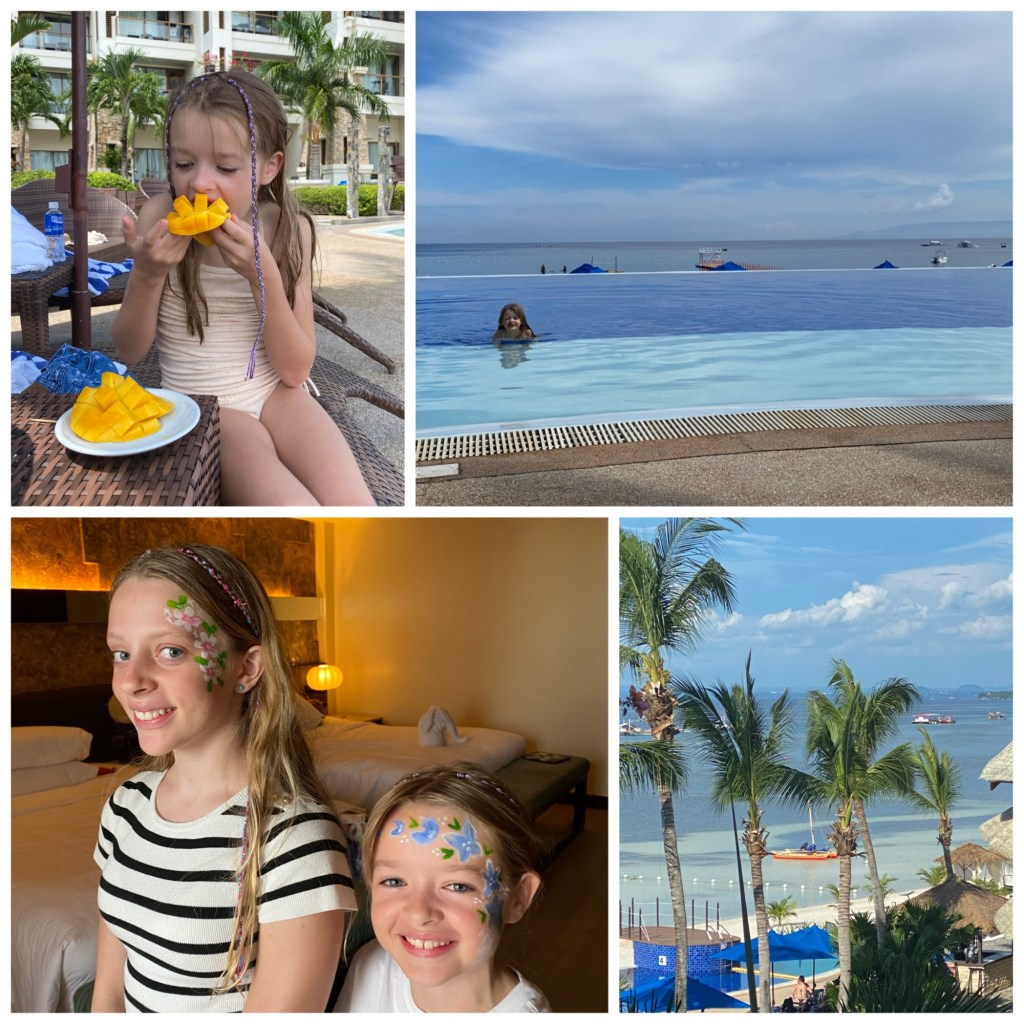 Nå har vi hatt to rolige dager her på Bohol. Ikke som i at vi bare har lagt ved bassenget, det er vi for utålmodig til. Og jentene synes ikke lengre at basseng er det gøyeste i verden. Men vi har holdt oss mest på og ved hotellet. Her har vi testen airhockey og bordtennis på lekerommet, hotellgymmet, spa avdelingen og selvfølgelig bassenget, stranden og restaurantene. Vi har seilt med hotellets seilbåt, snorklet og matet de sikkert 1000 koyene på hotellet med store mengder mat. Hans Christian har lånt sykkel og vært på sykkeltur hver dag, og i går ettermiddag tok vi oss en 15-minutters tuktuk-tur inn til nærmeste by. Her var det mye liv og mange fattige folk. Før vi visste ord av det hadde vi kjøpt diverse perler og armbånd, betalt et søskenpar som sang og spilte gitar for oss og jentene hadde fått fletter i håret. Da måtte vi bare skynde oss å dra hjem igjen før vi ikke hadde mer penger å komme oss hjem for😅