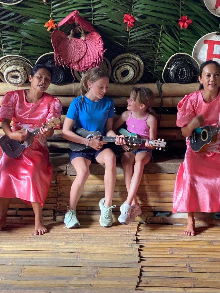 På dette tidspunktet var vi begynt å bli klare for lunsj. Heldigvis lå lunsjstedet 40 minutters kjøring fra toppene, noe som innebar at vi kjørte bort fra uværet. Lunsjen fant sted på en slags flytende restaurant. Så mens vi koste oss med buffet med lokal mat akkopagnert av et filippinsk band og dansende servitører, ble restauranten dyttet oppover elven av en liten båt. På veien stoppet vi med en liten brygge der lokalbefolkningen spilte ukulele og danset tradisjonelle danser. Alle fikk tilbud om å bli med, men bare jentene takket ja (etter litt overtalelse). Det var en koselig tur der vi fikk sett mye fin natur, og litt mer av hvordan folk flest bor.