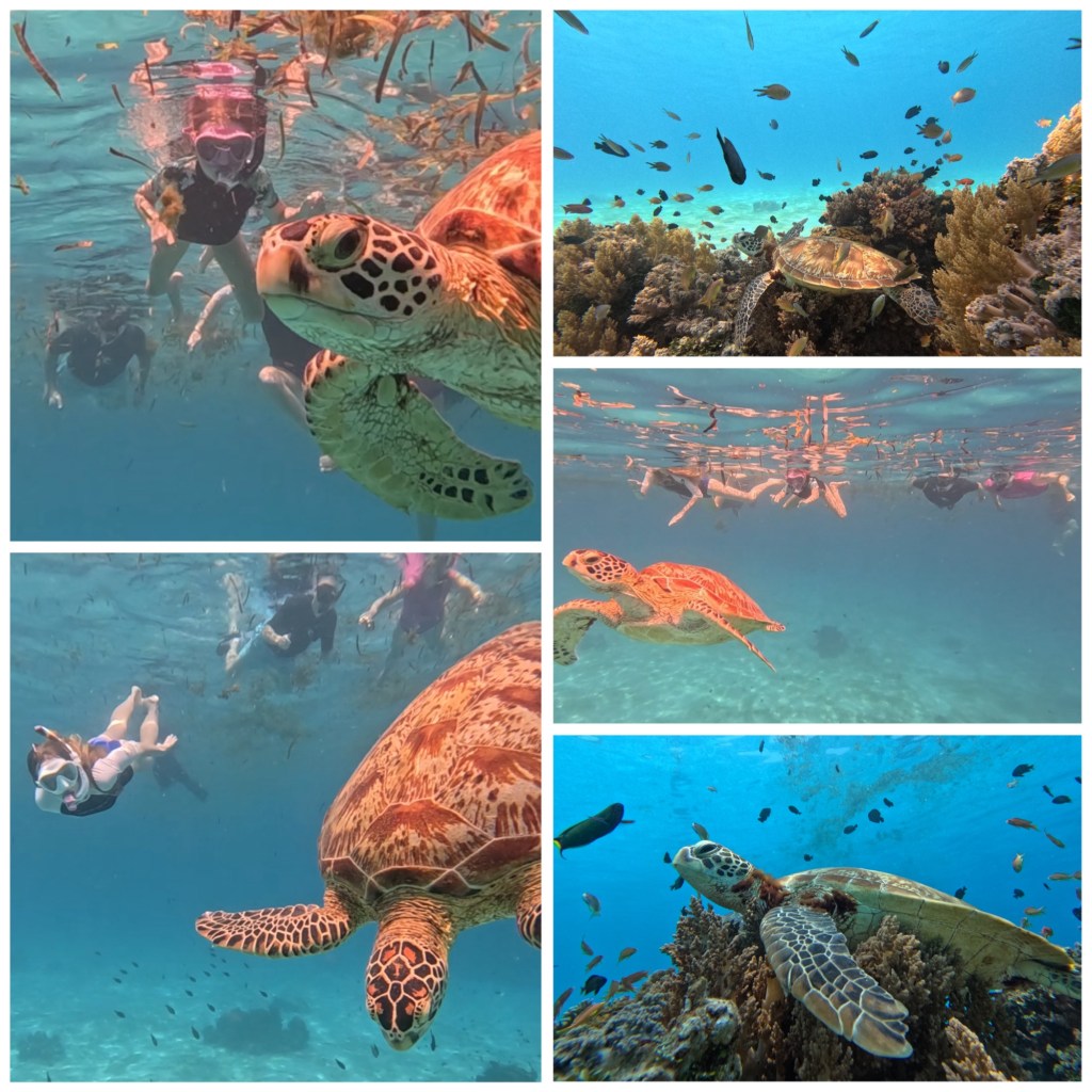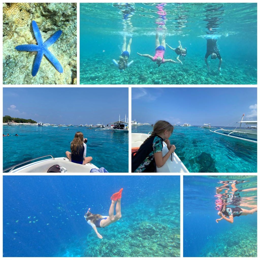 Hans Christian og meg synes det å snorkle er fantastisk kjekt, alle fargene og fasongene man finner i havet er helt utrolig. Vi har derfor jobbet for å overføre denne gleden til jentene, og det synes vi at vi har fått til bra. På flere av feriene vi har vært på i senere år har vi vært på snorkleturer, men vi har følt at den helt fantastiske snorkleopplevelsen har uteblitt. Forventningene var derfor skyhøye da vi ble plukket opp på stranden i dag tidlig. Etter om lag 40 minutter med deilig vind i håret var vi fremme. Det var også veldig mange andre turister, primært fra Korea. Men etter å ha basket litt med å finne en plass på stranden å plukke opp guiden, fant vi oss et litt roligere sted å snorkle ta. På det første stoppet var det fargerike fisker som var hovedattraksjonen. Og det innfridde til de grader! Vannet var krystallklart, og det var koraller og fisker så langt øye kunne se, i alle former og fasonger. Her holdt vi på nokså lenge. Hovedattraksjonen på andre og siste stopp var havskilpadder. Og allerede før vi var kommet frem fikk vi øye på en skilpadde i overflaten. Vel fremme og nede i vannet fikk vi øye på flere. På det meste så vi 5 skilpadder på en gang. De virket ikke like glade for å se oss som vi var for å se dem, noe som er forståelig da de ble fulgt etter av en skare turister hver gang de skulle opp og trekke luft. For oss var det i hvert fall en unik opplevelse. Snorkling på Balacasag får terningkast 6🤩