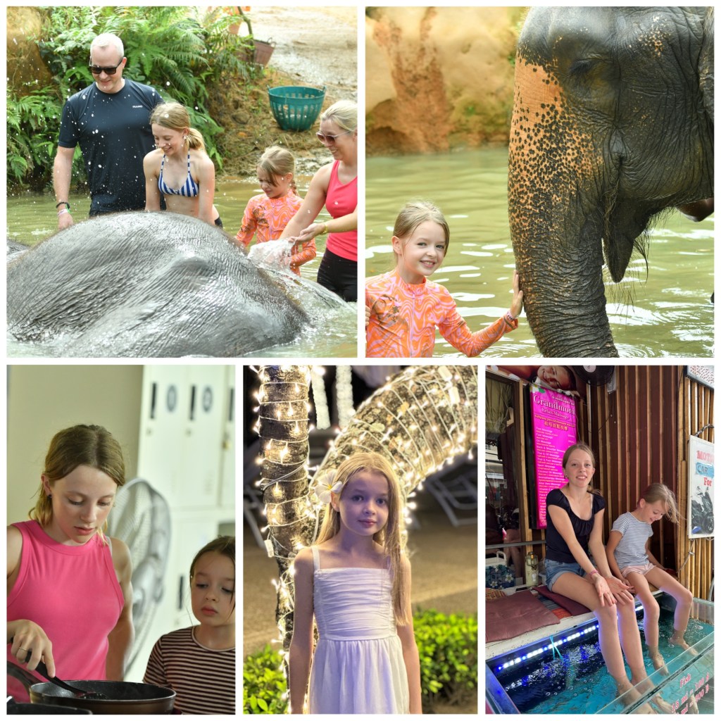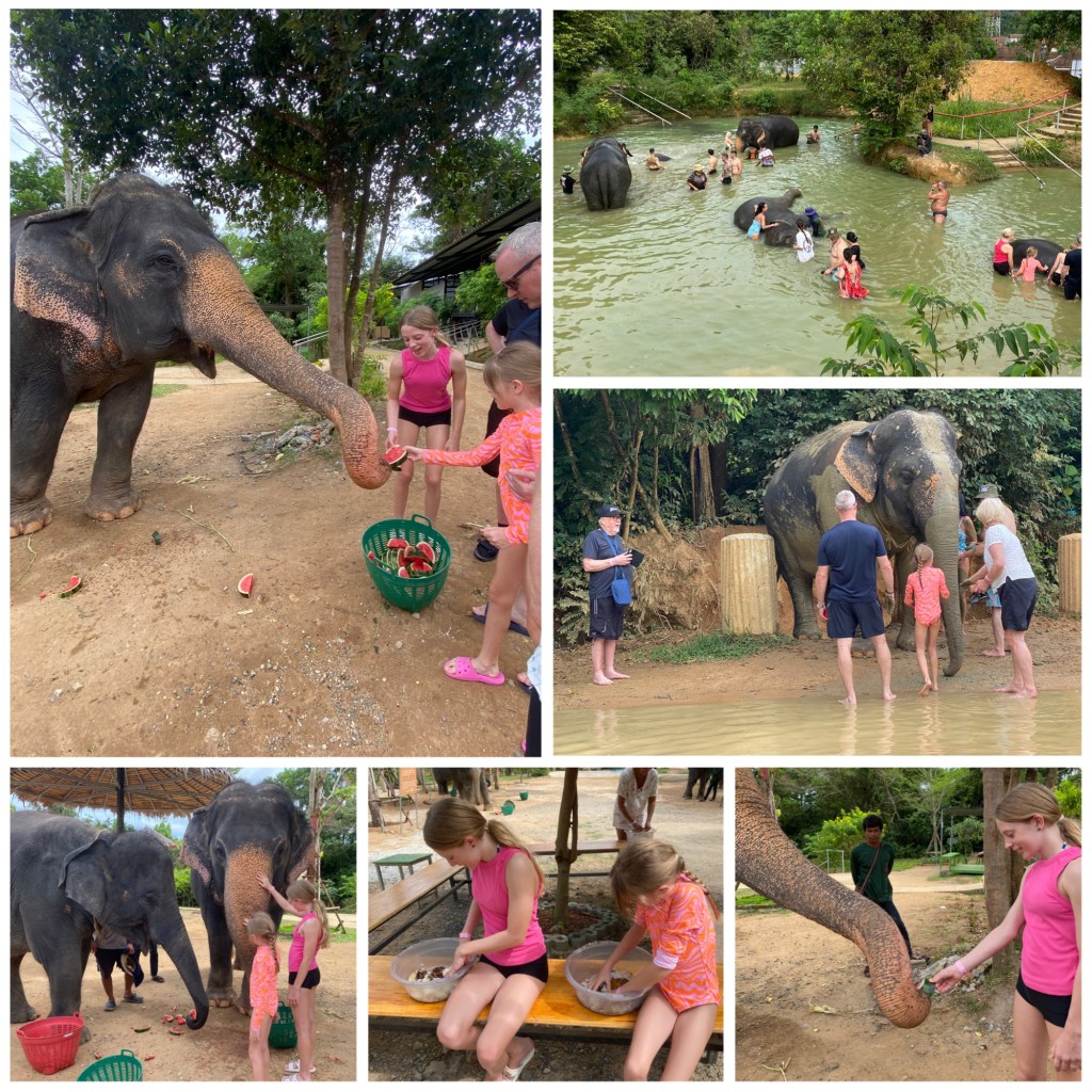 Første gang vi var på Phuket var i påsken 2022, og da bodde vi på et hotell som jentene har snakket om siden. Det var derfor litt ekstra stas å dra tilbake med farmor og farfar. Det var riktignok betydelig flere gjester der nå enn rett etter covid, men det var fremdeles helt supert. Allerede før vi dro hadde vi bestemt at vi ville ha med farmor og farfar til elefant-senteret der vi matet og vasket elefanter sist. De var litt skeptisk, men ble med likevel, og akkurat som oss synes de det var en unik opplevelse. Igjen fikk vi matet, vasket, svømt og dusjet med elefantene. Dette er elefanter som er reddet fra ulike steder i Thailand der de har blitt brukt (misbrukt) til tømmerproduksjon, sirkus eller riding. Da er det godt å se at de har det så bra her.