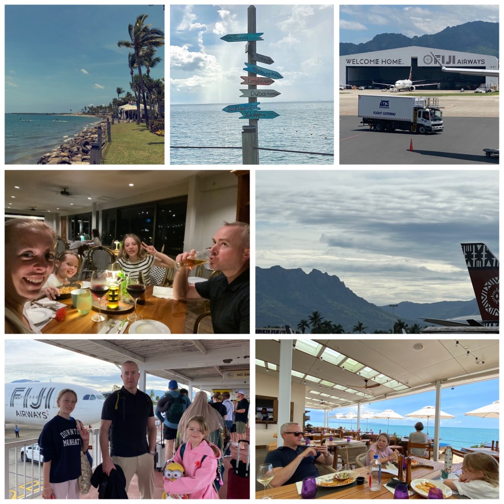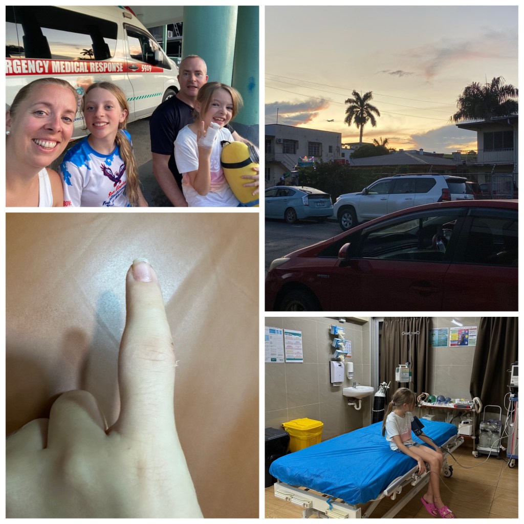 Etter en heller dårlig natts søvn på flyet dro vi til hotellet for litt mat og en rask strekk før vi skulle ut og utforske øyen. Vi skulle inn til byen og se på livet og kanskje shoppe litt, vi skulle en fantastisk solnedgang på hotellstranden og vi skulle se ild- og danseshow med polynesiske dansere på kvelden. Men først skulle vi bare teste ut det kjempefine bassenget. Da barna ble med en aktivitørene på hotellet ned til sjøen for å lære å åpne kokosnøtter (det er sånn de underholder barn på stillehavsøyer😜), hev også Nora seg med. I mens Nora jobbet med å åpne kokonsnøtter, fant vi andre ut at vi skulle teste ut sjøen. Det var helt nydelig, vannet var godt over 30 grader. Nora, stolt over kokosnøtten sin, kom etter hvert også ned til sjøen. Men på siste trinn var hun uheldig og falt. Det var ikke et dramatisk fall, men hun klarte likevel å lande på hånden, noe som gikk særlig utover lillefingen. Såpass gale ble det at vi konkluderte med at en lege burde se på den. Først sendte hotellet oss til en lokal lege, og derfra ble vi sendt videre til sykehus for røntgen. Til syvende og sist kom de frem til at det ikke var snakk om et brudd, i hvert fall ikke av den alvorlige sorten. Men da var allerede solen gått ned og danseshowet over. Det eneste vi fikk med oss var god mat. Det var jo ikke sånn vi hadde tenkt å tilbringe vår ene dag på Fiji, men uhell passer vel strengt tatt alltid dårlig. Det viktigste er at det endte godt. Og vi føler at vi har fått med oss litt av Fiji likevel. Vi har i hvert fall fått testet ut helsevesenet😅