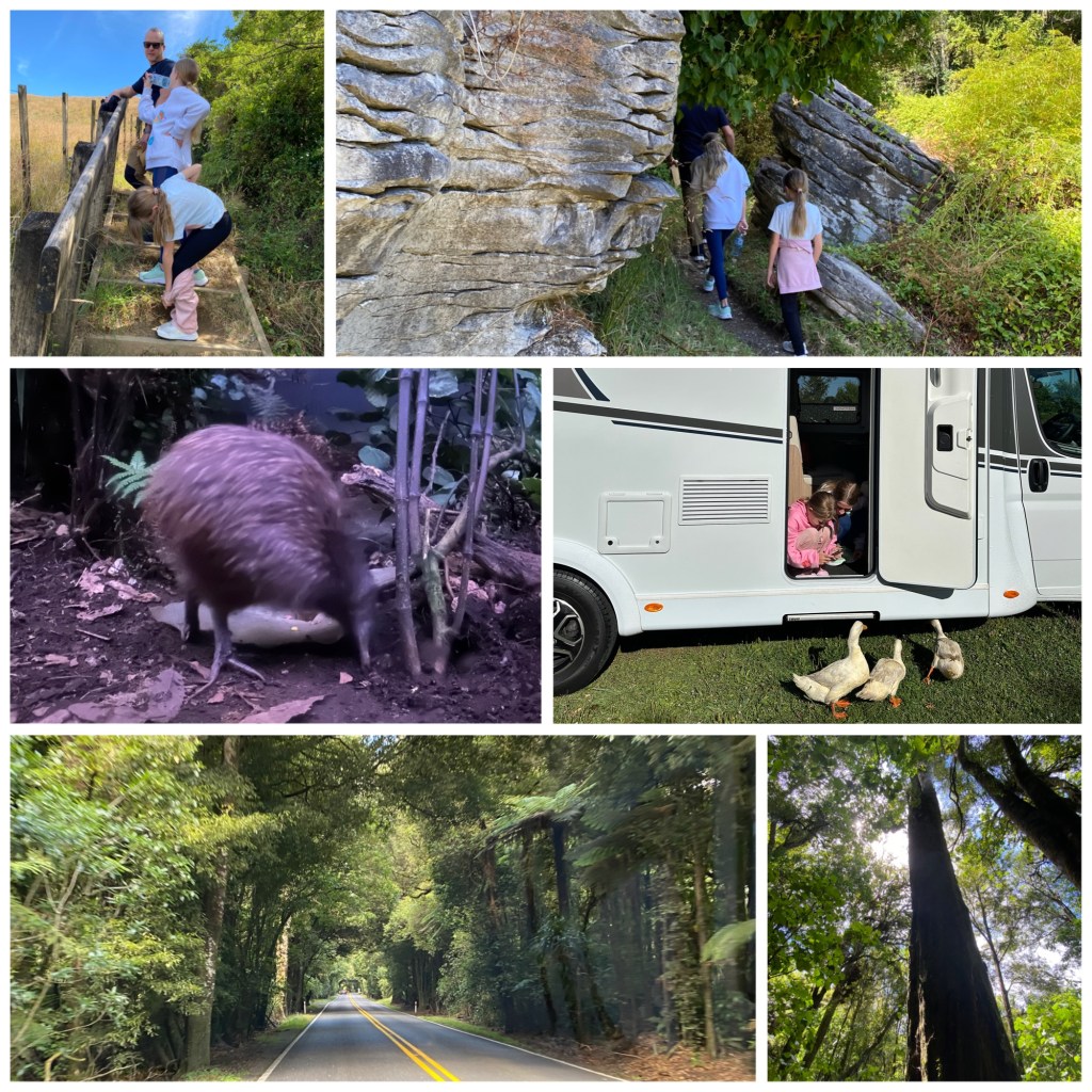 På vei ut måtte vi gjennom en suvenirbutikk, hvor vi fant noe skikkelig kul juletrepynt, nemlig kiwi-fugler med julenisse kostyme og med ski. Mens vi stod i kassen kom vi frem til at vi ikke kunne ha dem uten at vi hadde sett kiwier i virkeligheten. Her snakker vi altså ikke om frukten kiwi, men om New Zealand sin nasjonalfugl som er en liten, hårete, flygeudyktig fugl med langt, tynt nebb. Damen i resepsjonen informerte om at det lå en fuglepark kun 15 minutter unna, så da ble det vårt neste stopp. På vei tilbake til bilen tok vi en liten omvei innom en tursti som gikk opp til en topp i nærheten. Utsikten var ikke helt som forventet, men det var kjekt å få beveger seg litt.