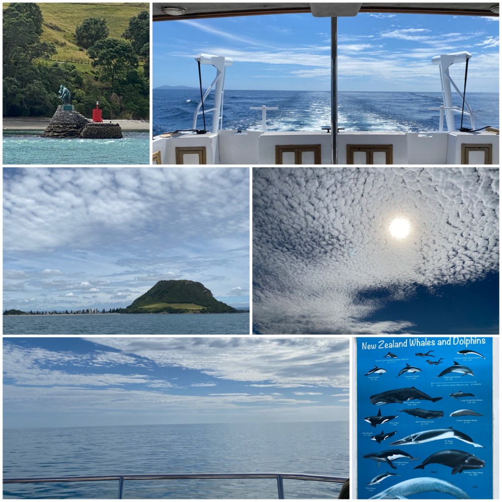 I går da vi ankom Tauranga var det nydelig vær, men likevel nokså sterk vind. Jeg begynte derfor å grue meg litt til dagen i dag. For på dagens program stod 5 timers delfin-safari. Sånne som meg som lett blir sjøsyk (og bilsyk og flysyk og tog syk osv😅) prøver jo helst å holde seg unna den slags. Men litt må man jo ofte. Heldigvis for meg var havet helt flatt da vi stod opp i dag. Så pass flatt at kapteinen på båten, svenske Heidi, var helt imponert. Vi dro tross alt rett ut i det åpne Stillehavet. Om vi hadde fortsatt til vi nådde land på andre siden hadde vi kommet til Chile i Sør-Amerika😬