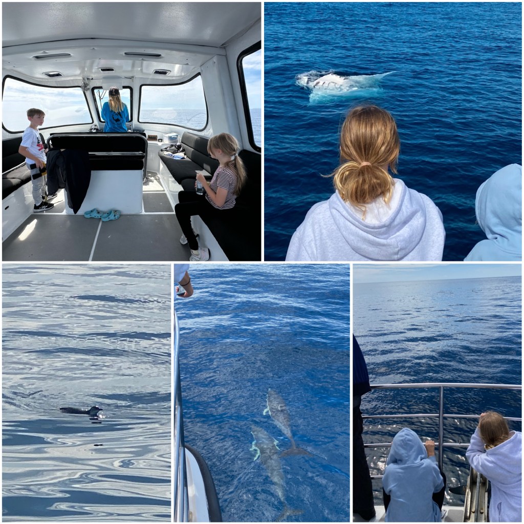 Til slutt kom vi frem til det splashingen var observert, og helt riktig var det delfiner. En hel flokk med mellom 40 og 50 dyr! Planen var at vi også skulle svømme med dem, vi hadde med våtdrakter og alt. Men myndighetene har en del regler rundt dette med svømming med dyrene. Noe vi egentlig synes er en god ting. Om dyrene er midt i å jakte, har barn i flokken eller prøver å dra fra båten skal de få være i fred. Og den flokken vi møtte hadde mange små delfiner, noen et par måneder gamle, noen bare et par uker. Utrolig søte😍 I hele 45 minutter holdt de ut med oss før de gikk lei og dro videre. Svømmingen får bli en annen gang.