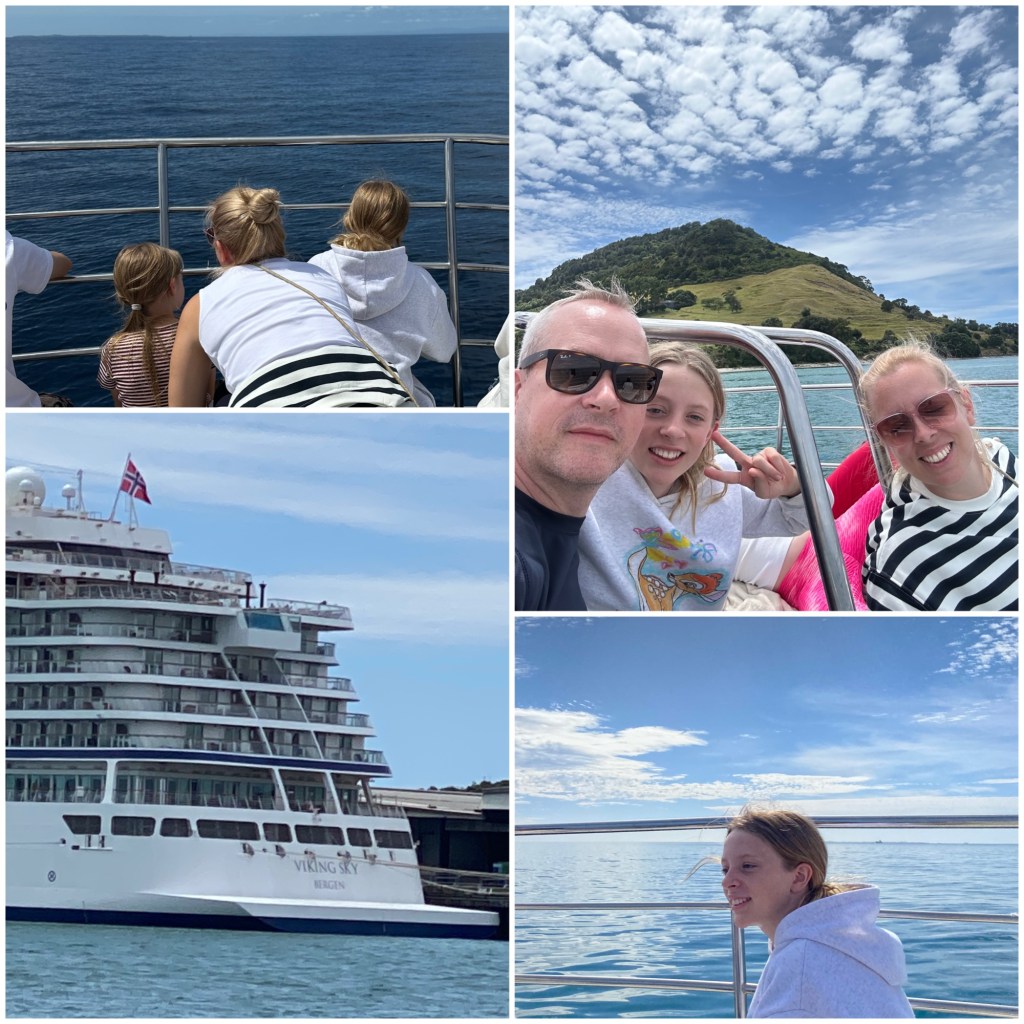 Etter dette fant vi ikke noen flere dyr, men da var vi allerede mer enn fornøyde. På turen hjem igjen nøt vi utsikten og det fine været. Nora fikk hjelpe kapteinen med å snakke på høytaleranlegget, og synes det var kjempe gøy. En annen litt morsom ting var at vi passerte cruise skipet Viking Sky i havnen. Den er registrert i Bergen, og for nesten ett år siden så vi den like utenfor stuevinduet vårt i Singapore.