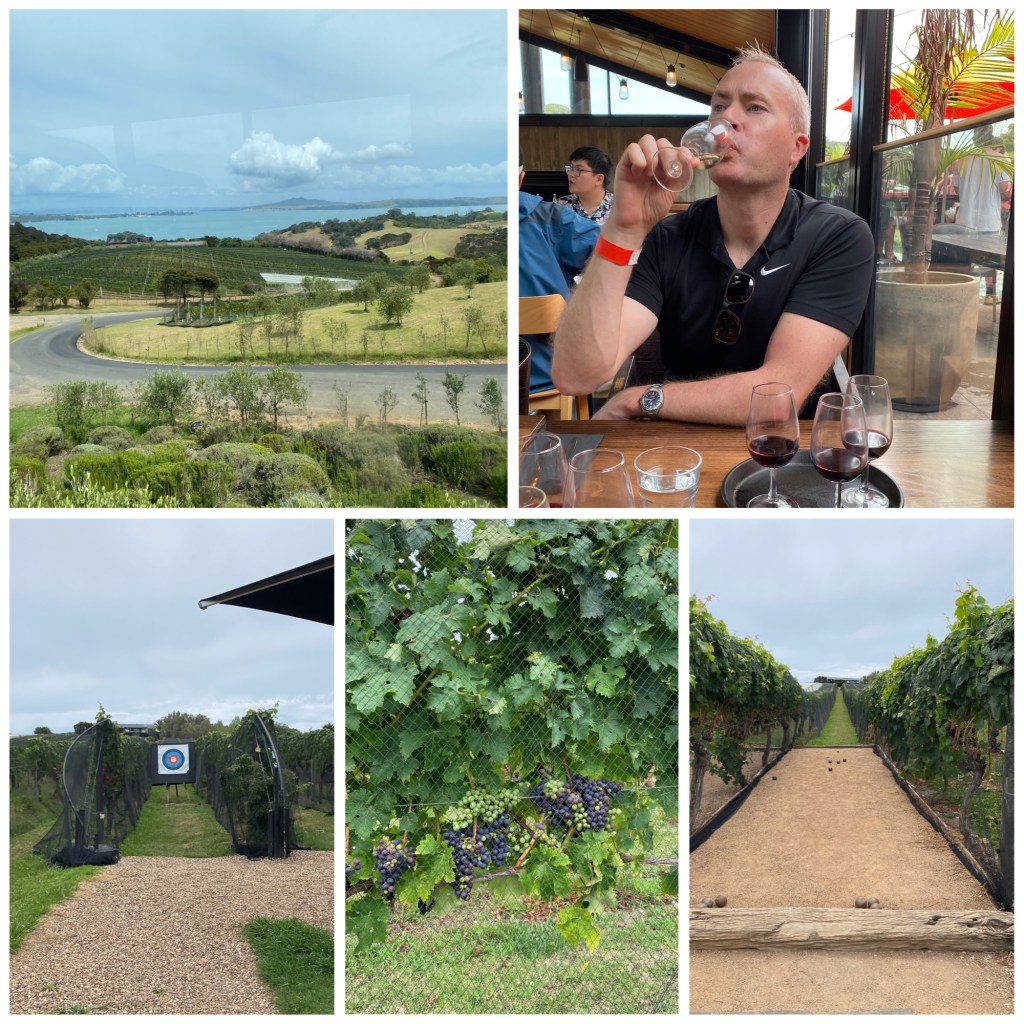 Om lag 40 minutter med ferge østover fra Auckland havn ligger øyen Waiheke. Den er nærmere 20km lang, og har en nokså kupert utforming med mange små strender, bakker og høyder (se kartutsnitt i bunnen her). Grunnet et veldig gunstig klima er Waiheke meget godt egnet for dyrking av vindruer. Øyen er derfor hjem til over 30 vingårder, hvor av de fleste tar i mot gjester for vinsmaking og matservering daglig. Man bør kanskje prøve å unngå å besøke alle på samme dag, men opplegget var i hvert fall veldig «brukervennlig». Hver halve time fra tidlig morgen til sen kveld går det passasjerferge fra Auckland og ut til øyen. Om du ønsker kan du kjøpe en kombi-billett som fungerer på både ferge og buss. Da står det en buss og venter i det man kommer frem på øyen. Gjennom hele dagen kjører en rekke busser av samme type runder på øyen, og så kan man gå av og på hvor og når man vil. Hvert av stoppene til bussen ligger enten ved en (eller gjerne flere) vingårder, en fin strand, et koselig lite tettsted med verdens beste is, eller på en oliven gård. Så går man bare fra veien og opp til den gården man vil besøke, alle ligger i gåavstand fra hovedveien. Helt genialt.
