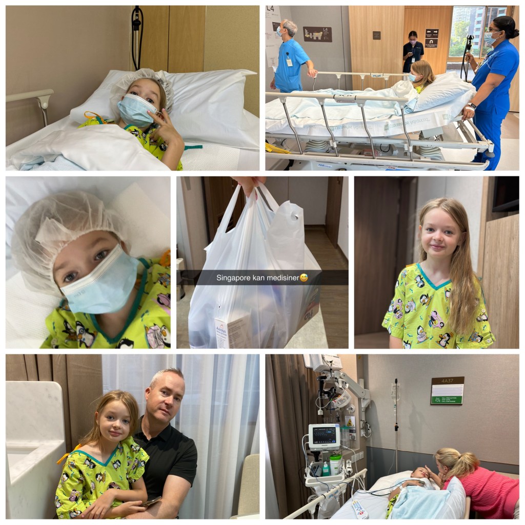 Mandlene til Nora har vært et problem i flere år. Vi har en mistanke om at de påvirker både spising og soving, og med det også veksten. Egentlig skulle de opereres ut før vi flyttet til Singapore, men grunnet covid gikk vi ikke tid. I Singapore oppsøkte vi etter hvert en lege for å få en ny vurdering. Konklusjonen var at det kanskje ville gå bedre etter hvert som Nora vokste. Men i høst, etter en runde med influensa, ble de veldig store og sånn forble de. Så nå var tiden inne for å få de ut. I samme renn ble også de falske mandlene (litt lengre vak i halsen) fjernet, deler av bløtvevet i nesen ble fjernet for å åpne luftveiene og noen blodårer i nesen driver og sprekker ble brent bort. En skikkelig opprensking med andre ord.