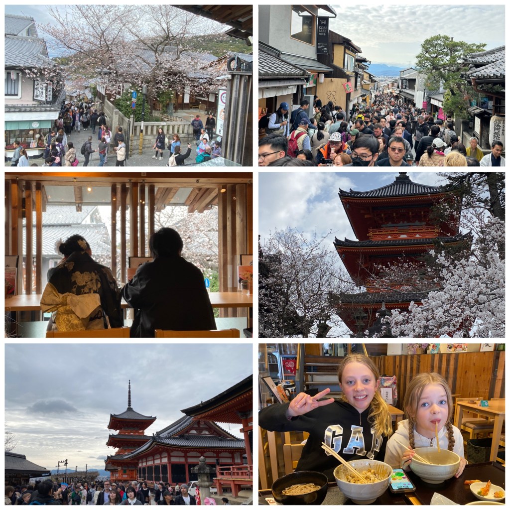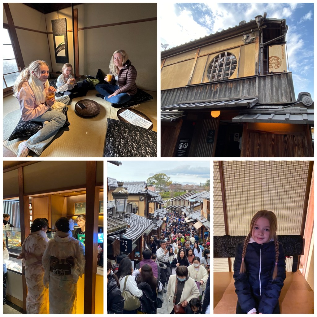 Som sagt har de mange kulturhistoriske bygg i Kyoto, så det var ikke bare bare å velge ut hvilke severdigheter vi skulle gå for. Vi startet med et område oppe i fjellsiden, Kiyomizu, kjent for sine gamle arkitektur og sine flotte templer på toppen. Tanken var veldig god, og området var helt nydelig. Men det var flere enn bare oss som hadde tenkt oss opp dit denne dagen, så det var meget folksomt. Uansett, vi fikk spist deilig, japansk lunsj, kjøpt spisepinner med navnene våre på, sett på templene og utsikten fra toppen og vi fikk prøvd å sitte på puter på gulvet på en Starbucks.