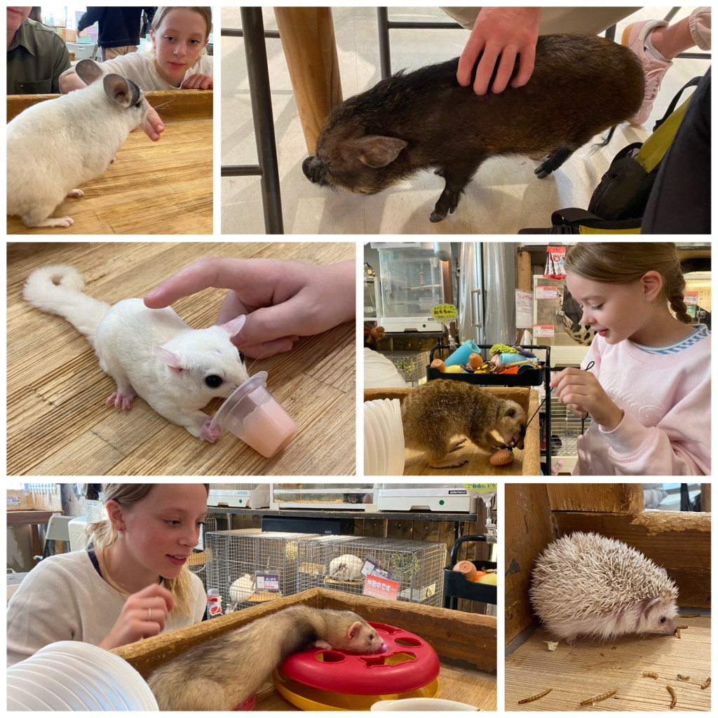 Caféen vi fant hadde et stort utvalg av dyr man kunne få klappe og kose på, og heldigvis kom vi såpass tidlig at vi fikk plass, det var nemlig rimelig fullbooket. Av dyr kan jeg nevne hamster, marsvin, rotter, kaniner, ildere, surikater, pinnsvin, papegøyer, chinchilla, haner og flyveekorn. Og en minigris som gikk løs😅 Veldig japansk!